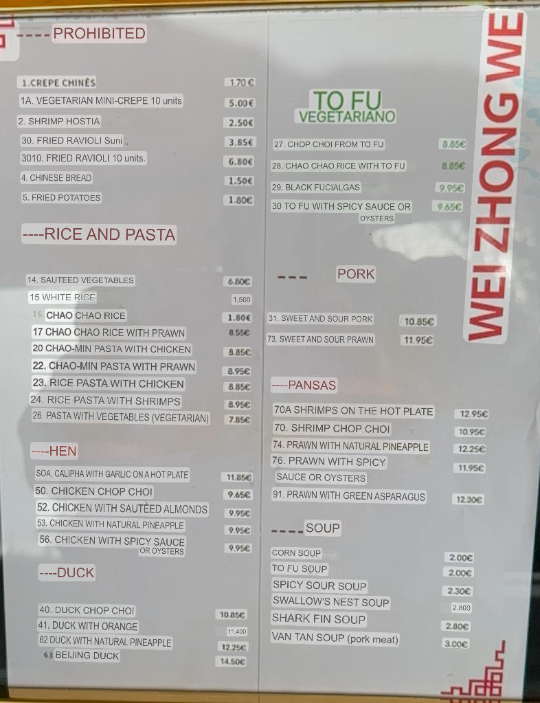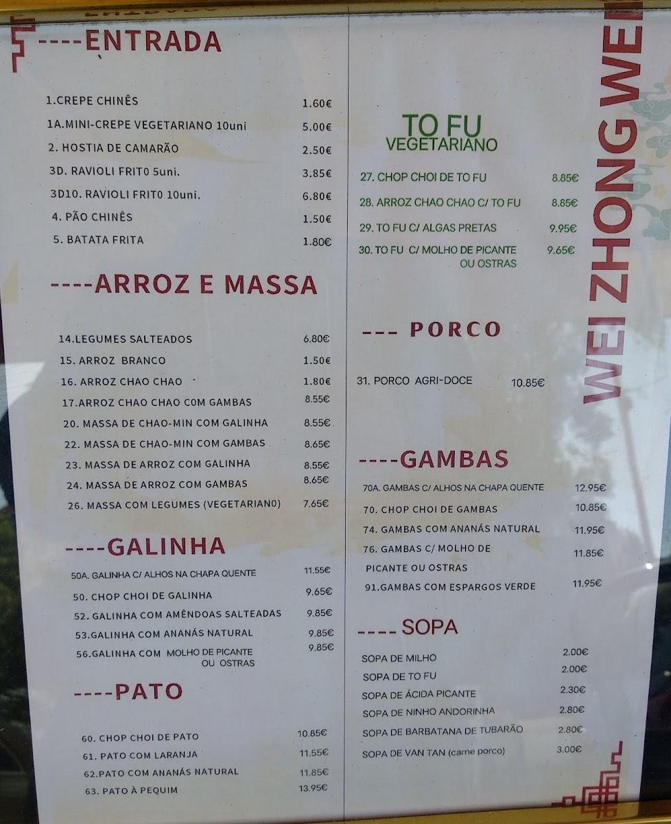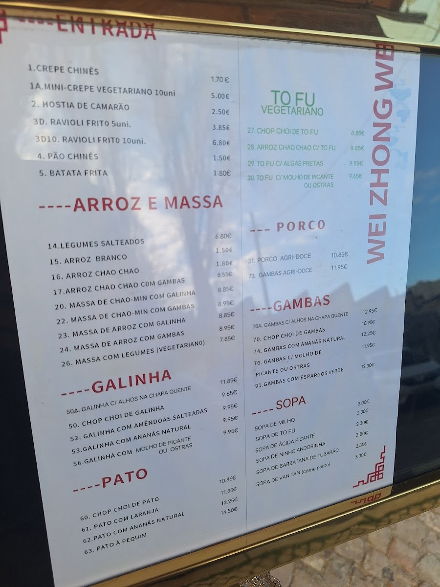 From a reviewer’s perspective, the menu at Wei Zhong Wei on R. Cidade de Lobito 282 in Lisbon offers a broad and diverse selection that caters to both vegetarians and seafood lovers alike. Vegetarians can enjoy dishes like Rebentos Soja Salteados, To Fu Com Molho De Ostras, To Fu Com Molho De Picante, Chop Suey Legumes, and Massa Chinesa Com Legumes, all showcasing fresh vegetables and well-balanced flavors. Seafood enthusiasts are treated to Gambas Com Espargos Verdes, Gambas Com Ananás, Chop Suey De Gambas, Brócolos Com Gambas, and Massa De Arroz Com Gambas, each prepared with care to highlight the natural sweetness of the prawns. For those seeking starters, the menu presents Sopa De Barbatana Tubarão, Legumes Salteados, Mini-Crepe Vegetariano, Ravioli Frito, and Crepe Chinês Grande, offering a tempting variety of tastes and textures. Meat dishes are equally appealing, with options like Vaca Com Legumes Na Chapa Quente, Porco Agri-Doce, Vaca Com Cebola, Pato Com Laranja, and Galinha Panada Com Amêndoas, each rich in flavor and portioned generously. The restaurant also provides versatile accompaniments such as Arroz Chao-Chao and Arroz Branco, along with sauces like Agri-Doce and Soja to complement the dishes. For a complete meal, the Crepe + Gambas Com Piri-Piri + Arroz Chao-Chao is a standout combination. Beverages include Sumol, Coca-Cola Original Lata 330ml, Pepsi, Guaraná, and Água 33cl, rounding out the dining experience. Overall, the menu at Wei Zhong Wei reflects both variety and authenticity, providing flavors that satisfy a wide spectrum of tastes while maintaining an approachable, casual dining atmosphere.